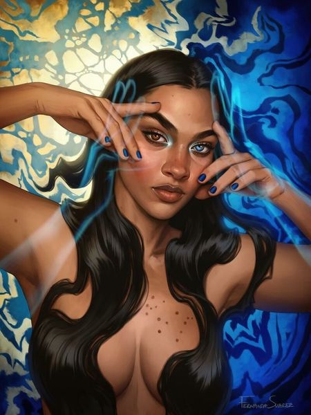 Fernanda Suarez created ‘Salt and the Sea,’ sometime in the 20th century. This image is a striking digital portrait bathed in monochromatic blues. It invites consideration of how women are perceived and portray themselves. The woman in this portrait isn't overtly sexualized, differing from many depictions throughout art history. She stands as an individual, her gaze both direct and introspective. The title, ‘Salt and the Sea,’ suggests an elemental connection to nature, perhaps reflecting the depth and complexity of female identity. The cool, almost melancholic tone could symbolize the emotional challenges many women face. How does this portrayal resonate with your own experiences or understanding of womanhood? The artist has rendered a space for quiet contemplation on the multifaceted nature of identity.