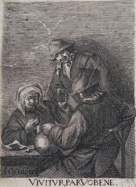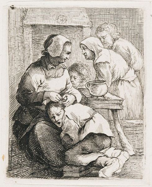 Editor: This is Cornelis Bega's "The Young Hostess." It's a rather dark and intimate scene, I notice the interplay of light and shadow. What are your thoughts on its composition? Curator: Indeed, the tonal range creates a compelling spatial structure. Observe the artist's use of line—how the density varies to suggest form and texture. The etching technique, with its network of linear marks, imbues the scene with a distinct visual rhythm. Consider how these formal elements contribute to the overall narrative. Editor: That’s so interesting! I can see how his technique contributes to the narrative. I appreciate your perspective! Curator: And I yours! Focusing on these intrinsic qualities is always a worthwhile exercise.