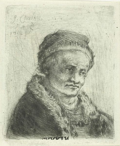Editor: This is "Volwassen man met bontkraag," created between 1790 and 1802 by Jan Chalon. It's a drawing or print, seemingly in graphite and ink on paper. The subject's expression feels very introspective. What aspects of the work strike you as most significant? Curator: Given the date and the artist’s neoclassical influences, it's worth considering this piece within the socio-political context of the late 18th century. Portraiture served distinct functions. How do you think images of men – specifically those with the markers of wealth seen here, like the fur collar – were consumed and understood publicly at that time? Editor: I hadn’t thought about how fur might indicate a certain status. Maybe these portraits functioned almost like public announcements? Displaying wealth or social standing? Curator: Precisely. Prints like this circulated widely. Think about the rise of the merchant class, the enlightenment ideals circulating, and consider who might have purchased this print and where they might have displayed it. Was this for personal enjoyment or public consumption? Editor: So the image’s value isn’t just artistic but also social. A way to understand how society saw itself? Curator: Exactly! These images both reflected and shaped the perceptions of power and status. By analyzing them, we gain insight into the values of that society, perhaps also into shifts in power, who wants to be seen as powerful, and what kind of aesthetic they valued. Editor: I’ll definitely look at portraiture differently now. Seeing art as part of a bigger social and historical conversation makes it way more engaging. Curator: Indeed. Art doesn't exist in a vacuum. Context unlocks deeper meaning.