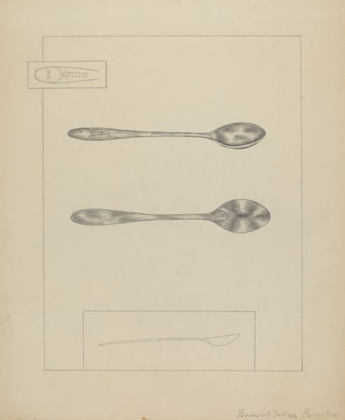Curator: This is Grace Halpin's "Pewter Spoon," created around 1937, rendered meticulously in pencil. Editor: Immediately, I'm struck by its almost ghostly quality. It's a simple, everyday object, yet Halpin elevates it through careful shading and detail. The light seems to bounce off the metal even though it’s just a drawing. Curator: Halpin's work often reflects a close observation of domestic life. Consider how the simple act of sketching this spoon intersects with gendered labor, given the historical associations of women and the domestic sphere. Was she critiquing or celebrating such roles, or simply observing? Editor: It’s intriguing that she included two detail studies alongside the full spoon rendering. The close-ups suggest she’s interested in design or craft traditions. We see etched ornamentation with initials, almost like a personal mark or family crest. It hints at the spoon’s history. Curator: Absolutely. Think about the era this was made – the late 1930s. Mass production was reshaping domestic objects. The attention to detail here could be read as a commentary on valuing handcrafted objects versus industrial ones. Halpin seems to pause, urging us to examine a very commonplace object. Editor: I find the realism captivating. Despite its utilitarian purpose, the spoon becomes an object of beauty, almost an artifact. Was Halpin making a subtle statement about value, imbuing worth to something society may undervalue? Curator: Precisely. Perhaps her interest lay in democratizing the art object itself – locating beauty and meaning in everyday settings, much like artists engaging with ready-made items. She presents the viewer with an intersection between social status, the intimacy of the dinner table and what defines artistic study. Editor: It’s amazing how a seemingly simple sketch can hold so many layers. It causes one to ponder on value, craft and domesticity. Curator: Indeed. It’s a testament to how artists, even with modest subjects, can prompt us to see our world anew, making something as humble as a spoon profound.