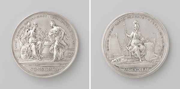 This silver medal, made by Nicolaas van Swinderen, commemorates the birth and death of the daughter of Willem IV and Anna van Hannover. The circular form is bisected by two distinct images, each meticulously detailed in relief. The gleaming surface catches light, emphasizing the contrasting textures and finely engraved details. On one side, a classical figure cradles a newborn, symbolizing hope and new beginnings. The opposite side depicts a complex heraldic crest, signifying lineage and power. The contrast between the maternal scene and the formal crest is striking. The medal's form becomes a semiotic device, its circular shape echoing cycles of life. The very structure of this medal – the arrangement of its imagery and the deliberate play of light and shadow – serves not merely as a commemorative object, but as a meditation on the transient nature of existence and the enduring power of lineage. Its dual images force a dialogue between personal loss and dynastic continuity.