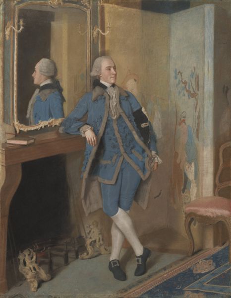 Editor: This is Johann Georg Ziesenis's "Portrait of Frederik, Heir Presumptive," painted in 1767 with oil on canvas. He looks so young, and almost a little unsteady in his stance, considering the weight of expectation surrounding him. What’s your interpretation of this portrait? Curator: Well, consider the historical context. Royal portraiture served as a tool for constructing and disseminating power. The Baroque style here, with its opulence and grandeur, reinforces Frederik's dynastic status. But what about the symbolism surrounding him? Editor: You mean like the fur-lined chair and the classical architecture? Curator: Precisely. They represent authority and lineage, rooting his identity in established power structures. However, there's also a drum and open book – alluding to possible themes of military accomplishments and enlightened leadership. How might this idealized portrayal obscure or manipulate Frederik's actual identity, turning him into more of a symbol? Editor: So, the artist is less concerned with capturing Frederik’s individual likeness, and more invested in communicating his future role within the monarchy? The portrait isn’t really "him", but more of a fabrication, a… prophecy? Curator: Exactly! The portrait engages in a dialogue of constructed identities – the weight of history versus individual agency. It makes you wonder: How much control did Frederik have over his own narrative, represented here for political consumption? Editor: This is fascinating. I had initially just seen a straightforward portrait of a young royal, but now it's clear this is really a constructed image, laden with symbolism about power, identity, and political agenda. Thank you for your insight! Curator: My pleasure! Analyzing the power dynamics embedded within such images opens a window into understanding how identity is shaped and used within social and political systems.