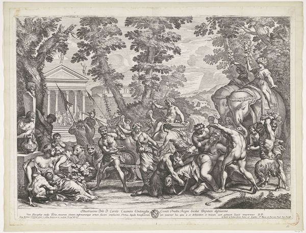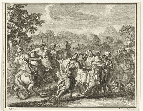 Étienne Gantrel created this print, "Verzamelen van het manna", around the turn of the 18th century. The scene depicts the Israelites gathering manna, the miraculous food provided by God during their journey in the desert. Made in France, this image operates within a cultural context deeply shaped by religious belief and royal power. The print visualizes a biblical episode, reinforcing the importance of faith and divine providence, but also speaks to France's own social hierarchy. The act of collecting manna can be seen as a metaphor for the distribution of resources, perhaps subtly commenting on the inequalities of French society under Louis XIV. Royal patronage of the arts often served to legitimize the king's authority. Understanding this print requires looking into both religious texts and the social conditions of 17th-century France, to fully grasp its meaning as a reflection of its time. The study of the artwork offers a view into the complex relationship between art, power, and social commentary.