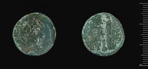 Editor: This is a coin from the Epeirote Republic, housed here at the Harvard Art Museums. It looks so small and corroded, but there’s something dignified in the composition. What strikes you about this piece? Curator: Note how the patination, the surface alteration from age, paradoxically obscures and enhances the relief. Does the corrosion amplify the original design or detract? Editor: I can see both sides. It obscures detail, but also gives it an antique aura. Curator: Precisely. The degradation product, copper carbonate, becomes integral to the object's aesthetic, an unintended collaboration across centuries. Editor: So, decay becomes part of the form. Fascinating! Curator: Indeed. A reminder that even in ruins, structure persists.
