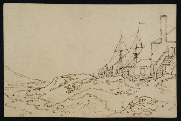 Editor: Here we have Philip James De Loutherbourg's "View of an Iron Foundry at Swansea". It's a sepia drawing and feels quite direct in its depiction. What visual elements stand out to you? Curator: The artist’s economy of line is remarkable. Note how the hatching suggests three-dimensionality, particularly in the kilns and the suggestion of landscape behind. Editor: So, it’s the technique, the linework itself, that you find most compelling? Curator: Precisely. The composition guides the eye. How would you describe the relationship between the industrial structures and the natural setting? Editor: The contrast is stark, but also harmonious in a strange way. Curator: Indeed. The formal qualities create an interesting tension. This piece really highlights the power of simple lines to evoke complex forms. Editor: I see what you mean; it’s less about what is depicted and more about how it is rendered.