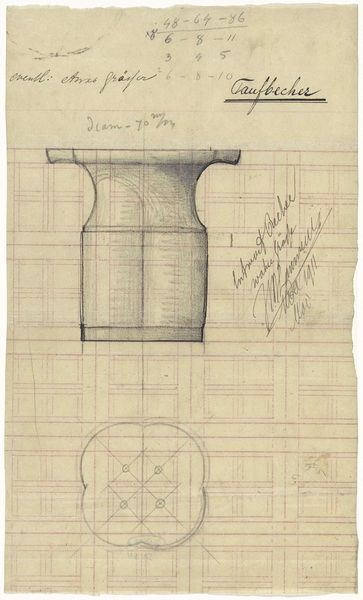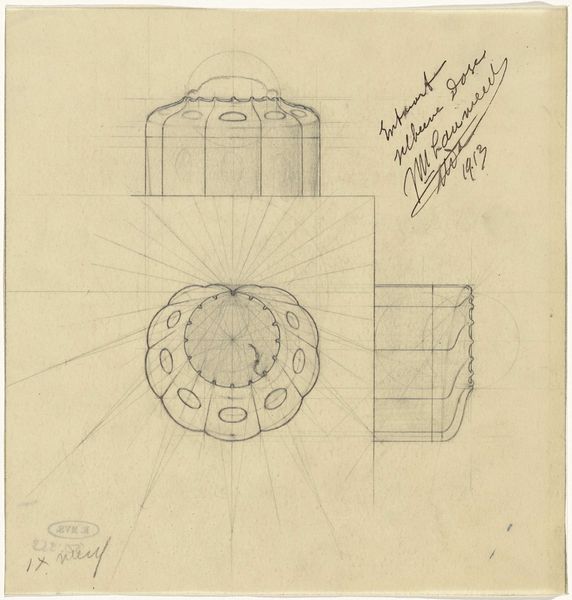 Editor: This is a design drawing, "Ontwerpen voor een juwelenkist," or "Designs for a Jewel Box," by Mathieu Lauweriks, dated between 1913 and 1918. It’s a pencil drawing on paper, with the blueprint-like aesthetic that makes it both precise and a little dreamlike. What captures your eye when you look at this piece? Curator: Oh, it's the delightful blend of the practical and the poetic, isn't it? The geometric precision married with the faint echo of Art Nouveau. I'm especially drawn to the way the object, though rendered in a technical style, almost seems to float on the toned paper. Almost a ghost of an idea... What about you? Anything catch your imagination? Editor: I’m struck by the fact that it *is* a design. It makes you wonder about the object itself and whether it ever existed. I like the soft color of the paper, it's a little rough-looking and warm... like an old sketchbook page you’d discover tucked away. Curator: Exactly! It is as much a window into the artistic process as it is a presentation of a potential product, isn’t it? Look at the shading - and those meticulously drawn circles and curves. And the question of function becomes secondary; it’s the beauty of form that truly takes centre stage. Does it inspire any thought about our own design processes? Editor: Well, it reminds me to slow down, I guess. In our digital age, design feels so instantaneous, and this sketch really highlights the intentionality and care that went into creating even everyday objects, even furniture, in the early 20th century. Curator: Ah, beautifully put! Perhaps this jewel box, realized or unrealized, lives on, reminding us to bring intention and maybe a bit more romance, into the world around us.