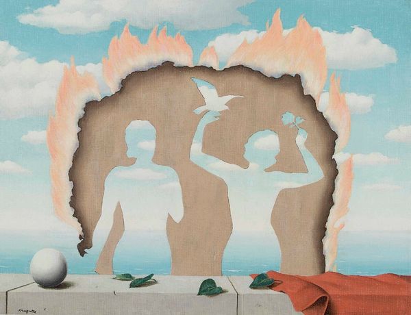 René Magritte created this puzzling scene, "Cosmogonie élémentaire," with oil on canvas. Magritte was a Belgian artist working in the Surrealist tradition. The image presents us with a fragmented figure in a desolate landscape, overlaid with motifs of earth, air, fire and water. The fire spewing from the vase, for example, hints at the destructive forces of nature. At the same time, it seems as though creation is happening before our eyes. Magritte, like other Surrealists, was interested in the workings of the unconscious mind. This was at a time when psychoanalysis was beginning to influence thinking about the human mind. But what is most interesting here is the way Magritte presents the natural world as just as bizarre and irrational as the human mind. The image seems to question the idea of a nature that can be understood by reason. To understand Magritte's work more fully, one might look into the history of psychoanalysis, the Surrealist art movement, and the cultural context of Europe between the wars. Art history shows us that the meaning of art depends on its social and institutional context.