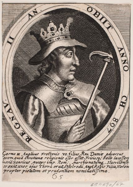 Editor: Here we have "Harald Hen," an engraving from 1646. It's a portrait, but it almost looks like a caricature. It has a slightly unsettling feel to it. What do you see in this piece? Curator: The power lies in the linear precision achieved through the engraving technique. Observe how the artist uses variations in line weight and density to define form and create tonal contrasts. Note, for instance, the intricate details in the crown versus the relatively smoother planes of the face. How does the oval framing device contribute to the composition? Editor: I suppose the oval concentrates our gaze on the subject, making the portrait more immediate. Do you think the inscription framing the portrait impacts our understanding? Curator: Precisely. The inscription serves not just as a label but also as a framing device, reinforcing the visual boundaries and drawing attention to the constructed nature of the image. The contrast between the detailed figure and the textual surround creates a tension that encourages deeper analysis. How might the symbols of power, such as the scepter and orb, function within this structured composition? Editor: Well, they seem intentionally positioned to balance each other, further reinforcing a deliberate sense of order and perhaps legitimacy, even with the hint of caricature. It seems less about immediate likeness, more about formal assertion. Curator: Indeed. The interplay of form, line, and symbolic objects transcends mere representation, engaging instead with fundamental principles of visual organization and the projection of authority through structured imagery. Editor: So, even without knowing much about the historical Harald, we can understand something about how the artist wanted power to be perceived through the strategic manipulation of form and symbolic elements? Curator: Exactly. By analyzing the formal qualities, we unlock a richer understanding of the work's meaning beyond the literal depiction.