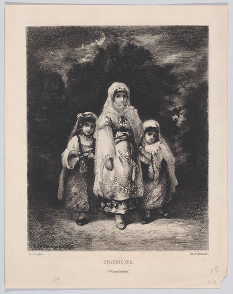 Editor: This is Théophile Alexandre Steinlen’s "French Children," from the Harvard Art Museums. It looks like a pen and ink drawing, and I'm struck by the way the figures are arranged, almost like a frieze. What compositional elements stand out to you? Curator: The linear arrangement is indeed crucial. Note the artist's use of varying line weights and densities to create depth and texture, especially in the children's clothing. How does the restricted palette influence your reading? Editor: It creates a somber mood, almost like a study of light and shadow. I guess I'm wondering what the relationship is between the figures and their setting, which is so stark. Curator: The setting, rendered minimally, serves primarily as a spatial anchor. The focus remains on the figures, their forms, and their relationships. The hatching technique creates subtle tonal gradations, drawing us into the nuances of their expressions. Editor: I see that now. Thanks, I have a better appreciation for how Steinlen uses simple means to create a visually engaging composition. Curator: And I'm glad to have considered the starkness of the setting alongside its impact on the figures.