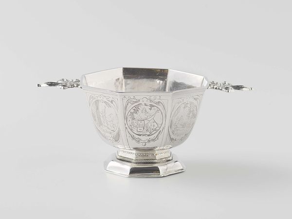Curator: This is a brandewijnkom, a brandy bowl, crafted in 1667 by Scholte Janssen II. It’s made of silver, a luxurious object signaling wealth and status. Editor: It gleams! The light just bounces off it. Even now, encased behind glass, it almost feels… alive. The delicate engraving work looks so refined, precise. Curator: The Baroque style is quite prominent, particularly in the decorative flourishes around the bowl's edges and its ornate handles. Those handles – what details! And of course, its intended purpose, for communal drinking, connects it directly to rituals of conviviality and social bonding. Editor: There's a tension here, isn't there? Silver, usually associated with delicate dining, with the sharpness and strength perhaps needed for the more aggressive flavors of a spirit? It’s also undeniably Dutch. Do you think its craftsmanship represents a moment in Dutch cultural pride? Curator: Absolutely. Remember the 17th century was the Dutch Golden Age. It would have symbolized Dutch power and trading might, where commodities flowed freely. This bowl embodies not just a spirit of celebration, but perhaps also a sense of self-assuredness tied to colonial practices of the era. The very substance, silver, bears witness to those dynamics. Editor: How does this vessel invite participation, though? What were the cultural implications when sharing such a commodity-heavy object in the space of commensality? Were lower social strata privy to its table? What did it mean for the disenfranchised to be spectators, or excluded altogether? Curator: Those are pertinent and vital points to ponder. Drinking vessels such as this weren’t merely functional objects, but carefully constructed signs, declaring membership, authority, and privilege. The coats of arms are perhaps evidence of familial heritage or allegiance... I agree— we shouldn't lose sight of those it necessarily excludes in its shimmering expression of bounty. Editor: The way the facets catch light is a compelling effect—a physical display of the intangible effects of imbibing in general? So the brandewijnkom invites not just drink, but questions surrounding labor and material power as well, even across time and context. Curator: An important consideration and precisely why exploring material culture is such a powerful mirror for our shared past and present. The layers revealed here, literally in the metal itself, give pause for rich conversation!