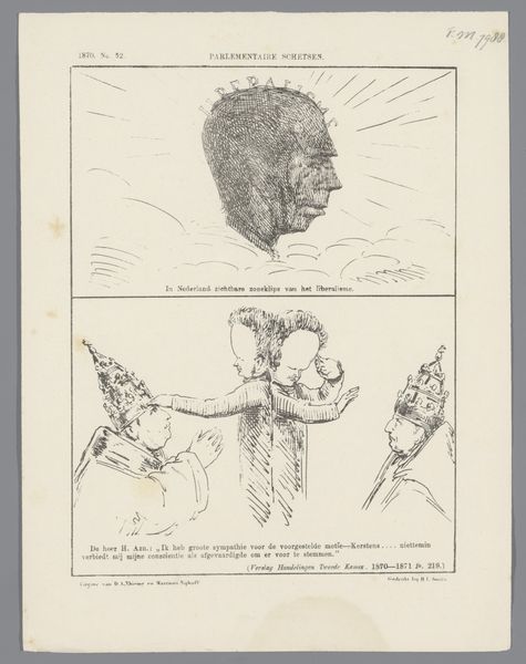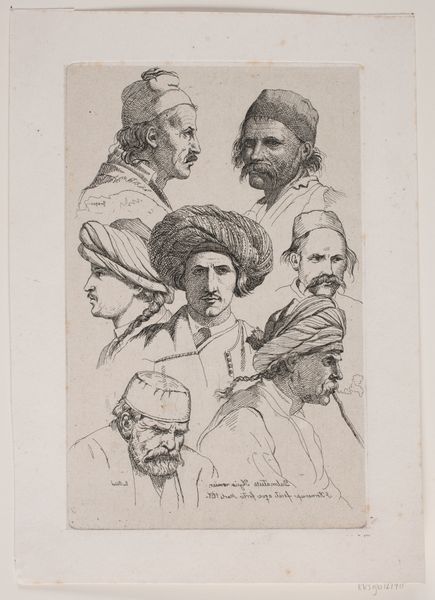 Curator: Before us we have Isaac Weissenbruch's "Six Heads of People of Different Human Races," a graphite drawing that resides here at the Rijksmuseum. It was created sometime between 1836 and 1912. Editor: My immediate impression is one of cool detachment. The grey tones and the sheer number of subjects presented in near-identical profile create a sense of scientific observation rather than intimacy or emotion. Curator: Precisely. And it's critical we understand the era in which this was made. In the 19th century, scientific racism was pervasive. Weissenbruch’s work needs to be contextualized within the colonial power structures and pseudoscientific methodologies of the time, focusing particularly on physiognomy. Editor: I see what you mean. There’s a rigid order and implied hierarchy established by the arrangement and uniformity of the portrayals. Still, regardless of how the subject is intended to function symbolically, you have to acknowledge that it’s incredibly rendered—look at the detail in the individual hairs or feathers, captured expertly by varied graphite strokes. Curator: These very marks of skill become implicated in a troubling enterprise. We need to address the objectification and how supposedly objective renderings like these can contribute to systems of discrimination. How is this seemingly neutral medium weaponized when the portraits become documents? Editor: I understand, but as a student of aesthetics, I still fixate on the application of the medium—that gradation from shadow to light on their features. I find value simply in the elegant rendering itself, without condoning any ideological context. Curator: I recognize that aspect as well, though separating the artistry from the work’s complicated history seems like a dangerous path, particularly with pieces such as this. I believe our audience must know the truth of history, so we can break through it, and begin to establish true agency for the people depicted in this sketch. Editor: So it goes; I will agree to disagree! Still, it's given me plenty to ponder. Curator: Indeed. The beauty and the unsettling nature of Weissenbruch’s piece are eternally bound together and cannot exist on their own. This artwork compels us to engage with that struggle and to push forward, as uncomfortable as the road is.