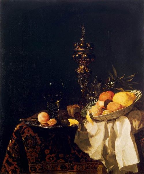 Editor: This is "Still Life with Bread and Eggs" by Paul Cézanne, painted around 1865. It’s an oil painting, and you can really see the texture of the brushstrokes. It’s quite dark, somber almost. What catches your eye when you look at this? Curator: I’m immediately drawn to the physicality of the paint itself. Notice how Cézanne builds up the surface with thick impasto, especially on the bread and the white cloth. It’s not just representation; it’s about the labor of applying paint, the material reality of the canvas becoming an object in itself. Editor: So, you’re focusing on the process rather than just what's being depicted? Curator: Precisely. Think about the social context. This was a time of industrial revolution, mass production. Cézanne is, in a way, asserting the value of handmade, slow, deliberate creation against that backdrop. Each brushstroke is a conscious act, a resistance to the dematerialization of labor. Editor: I never thought about it like that. The impasto makes so much sense now. Curator: Consider the starkness of the composition too. The dark background, the simple arrangement. It avoids the seductive illusionism of academic painting, emphasizing the basic materials – bread, eggs, glass, cloth. These were staples, everyday objects, made monumental through the act of painting. Are we celebrating basic means of life? What do you think the starkness adds? Editor: It definitely grounds the painting, makes it about the everyday. Maybe Cézanne is showing that there’s beauty and value even in the simplest things, if you really look. I see how it comments on both labor and the process of its production. Thanks, I really learned something! Curator: And I think analyzing the painting like this has furthered my insights into Cézanne’s unique view of materialism as he sought to translate lived experiences to material expressions.