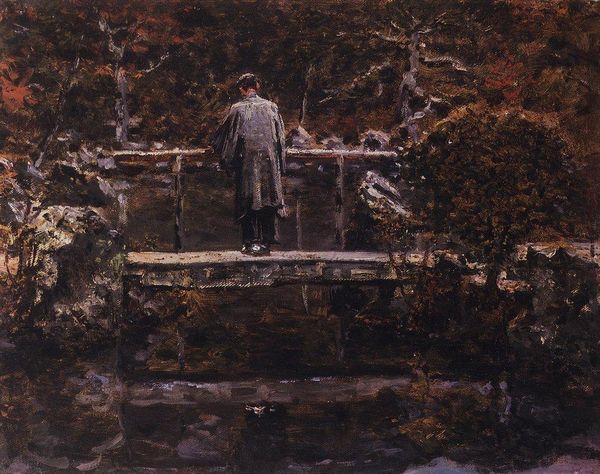 Vasily Vereshchagin painted this oil on canvas, titled "In the Park". A somber figure cloaked in black evokes contemplation, a symbol of introspection. Consider the recurring motif of the flâneur, or stroller, in art. Figures like these echo through time, from Caspar David Friedrich’s wanderers to the anonymous crowds in Impressionist paintings of Paris. They represent a modern state of mind, one where individuals are both part of and apart from the world around them. The color black itself carries heavy cultural weight. Often associated with mourning, and a symbol of power, but here, against the muted colors of the park, it evokes a sense of solitude and mystery, stirring our subconscious understanding of loss and the unknown. The reflection of the dark figure in the water, too, adds a layer of psychological depth, suggesting a confrontation with one's own inner self. Such symbols have a life of their own, appearing and reappearing across epochs, constantly being imbued with new meaning, a testament to their enduring power over the human psyche.