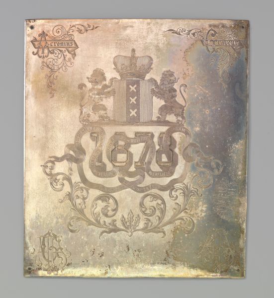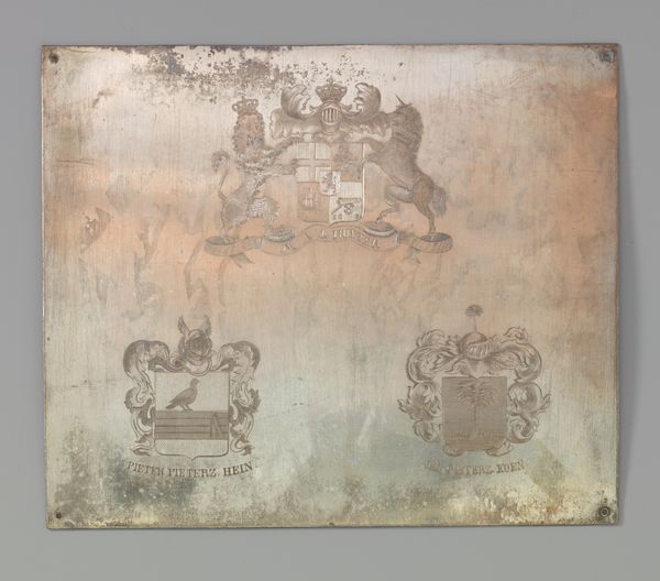 Editor: This engraved metal print from the early 20th century, "Wapens van Maarten Tromp en Olivier Cromwell," depicts heraldic crests. The piece seems to convey both strength and, strangely, a kind of vulnerability given the corrosion on the metal. What symbols jump out to you? Curator: The most obvious are the lions, traditional symbols of courage, nobility, royalty, strength, and valor. Consider how the artists chose to depict them—regal and proud, acting as 'supporters' to the shields. Note, too, the banners displaying text, acting as carriers of meaning. What feeling do those components evoke in you? Editor: I suppose it feels rather formal, almost like an official declaration of sorts, a sort of family history rendered as impenetrable visual code. But beyond that, how would this have been understood? Curator: Heraldry, in general, is rooted in history and social standing; crests such as these were potent symbols in their time, communicating lineage, allegiance, and personal qualities. By depicting the arms of Tromp and Cromwell, figures from opposing sides of the Anglo-Dutch Wars, the piece speaks to a complex history of conflict and perhaps even reconciliation through visual rhetoric. But there is an evident focus on symbols related to power! Do these animals look the same, symbolically speaking? Editor: That is a good question, because one side is more complex and has animalistic elements. I hadn't noticed at first glance but, upon reflection, you are right: a deliberate artistic decision would need to have been made. Curator: Indeed, one is very deliberately more elaborate! Now reflect on what the implications are, thinking about your initial impressions! Editor: Thanks, I now appreciate how the artist's choice of specific symbols conveys particular layers of meaning regarding power and history. Curator: Exactly! Recognizing these visual strategies unlocks a deeper understanding.