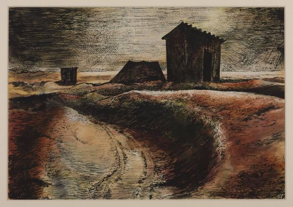 Curator: Here we have Giovanni Fattori's "The Tower of Magnale," painted in 1890. It's an oil painting currently housed in the Museo civico Giovanni Fattori in Livorno, Italy. Editor: Stark. It hits you like a wall. That ochre tower against the bleak sky feels both lonely and defiant. Curator: Indeed. Observe how Fattori employs broad, horizontal brushstrokes to define the sky and ground, creating a sense of vastness. This accentuates the monumentality of the tower, though its form is simplified, almost abstracted. Editor: Simplified is an understatement. It's like a memory of a tower, the essence of its verticality, barely tethered to the earth. And that restrained palette! Earthy browns, muted blues—it whispers of resilience in the face of… something. Loss, maybe? Curator: Precisely. One could argue that the color choices are deliberate, serving as signifiers of the tower's historical context and its potential decline. Consider the visible brushwork; it doesn't seek to disguise itself, but instead, reinforces the materiality of the paint itself. Editor: Okay, but on a gut level, it feels more personal than theoretical. Like he wasn't just painting a tower, but channeling a feeling. Did something happen to Fattori that year? There’s this melancholic, almost haunting vibe… Curator: While biographical readings are valid, one must also analyze the formal relationships within the composition. The placement of the tower relative to the horizon line, for example, creates a visual tension that draws the eye upward, yet also traps it within the horizontal planes. Editor: Traps it! Exactly! Maybe that's the genius. That he could turn a seemingly simple landscape into something that locks you into a very specific feeling. You want to escape, but you're held captive by its desolate beauty. Curator: Ultimately, the painting invites us to contemplate the enduring power of architectural forms against the relentless passage of time, all while showcasing a mastery of artistic technique. Editor: Right. Plus, for me? It's a stark reminder that beauty can be found in the bleakest places, in the simplest forms. Pretty profound for what looks like, at first glance, just a brown tower on the beach.