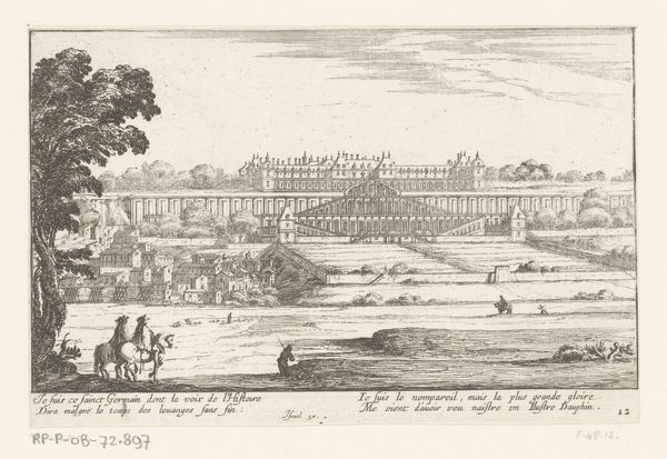 This etching is titled "Gezicht op Charité-sur-Loire, met links op de voorgrond herders met koeien" and was created by Israel Silvestre in the 17th century. The composition of this image uses a high vantage point, offering a panoramic view of Charité-sur-Loire. Silvestre employs a structural approach, dividing the scene into distinct horizontal layers: from the pastoral foreground with grazing cows, across the river and its arched bridge, to the distant town. The use of line is particularly striking here, where it meticulously describes textures and distances, and where light and shadow convey depth and volume. Notice how the architecture of the bridge and town is rendered with precision, with the overall effect of order and clarity. Silvestre’s calculated representation does more than depict a landscape; it constructs a visual order, and invites us to consider the interplay between nature and culture through a carefully articulated structure.