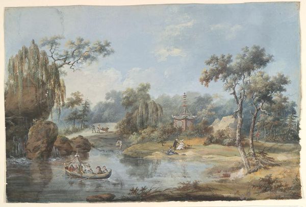 Curator: "Waterval te Tjieroek Betong Java" by Charles William Meredith van de Velde, probably executed sometime between 1838 and 1898. The artist worked in watercolour, seemingly en plein air, to create this Orientalist landscape. Editor: It has this soft, dreamy quality about it. The light feels hazy and the colors are muted; like a memory or a beautiful postcard. Curator: Indeed. Note how van de Velde utilizes watercolor washes to capture the tropical foliage. The application is incredibly skillful and layered. He builds depth using thin, translucent strokes, which give it a vibrant yet soft feel. Considering the plein-air execution, one wonders what the experience was like, the materials he needed to lug in this hot environment. Editor: It's intriguing how he uses light to draw the eye across the painting. From the figures on the bank, past the boat, to the dense jungle. But those figures; what's the interplay between them? A transaction, or simply conversation, near a vital route for people and goods? The river offers more than just transport. Curator: The figures are fascinating. It encourages me to investigate not just van de Velde’s artistic perspective, but also how the local population adapted this waterway for survival and social exchange. What tools did they use, what agreements, perhaps exploitative or supportive ones were involved to ensure the boats could reach the other side? Editor: Exactly. The materiality of the paper, the paints, and van de Velde's specific gestures combine to generate an intimate portrayal. We're both distant viewers and close observers due to the composition and detailing. It's really quite transportive. Curator: I see it that this watercolour encapsulates the intersection of artistry, production, environment and local agency during that time. Now what do you make of its formal structure? Editor: Van de Velde's watercolor truly demonstrates an immersive way to experience another reality and a place in time. A moment is frozen, preserved, and accessible for others to decode in a way they connect to and reflect upon, long after.
