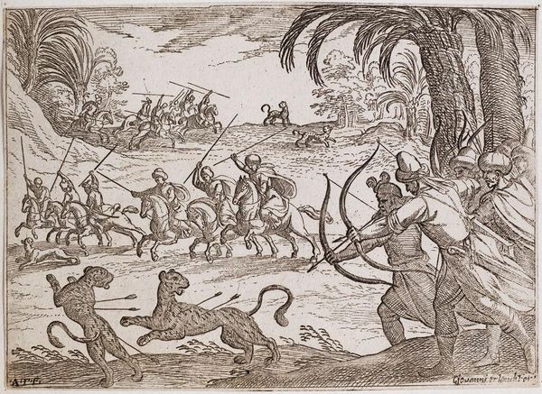 Editor: This is Antonio Tempesta's "A Wild Bull Hunt." It's hard to put a date on it, but it certainly feels alive with energy, even if somewhat chaotic. The hounds, the bulls, the people – it's all so frenetic! What do you see in this piece? Curator: The hunt is a recurring motif, laden with cultural weight. Notice how Tempesta orchestrates this chaos? He draws from classical and biblical imagery, where the bull often represents untamed power, even evil. The hunt then becomes a symbolic subjugation. Editor: Subjugation, really? That's a darker reading than I initially had. Curator: Indeed. Think about the cultural memory embedded within these symbols. The hunt isn't just sport; it's a display of dominance, a narrative of control over the "wild" aspects of both nature and ourselves. Does this shift your perspective? Editor: It does. I see it now as more than just a hunting scene. It is heavy with historical implications. Curator: Precisely. Symbols speak volumes across time.