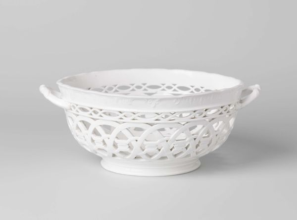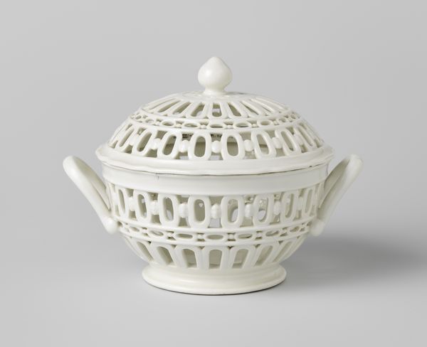 Editor: Here we have a lovely Loosdrecht porcelain lid, or "Deksel, opengewerkt," dating back to around 1778-1782. It feels very delicate and precise with all the lattice and braided handle. What catches your eye in this piece? Curator: The formal arrangement of this porcelain lid exemplifies rococo aesthetics. Consider the interplay between solid and void, achieved through the opengewerkt technique—or openwork, which is what we see here. It’s a dance of positive and negative space that invites visual exploration. Editor: Right, all the little spaces and curves create visual movement. What about the handle; does that have some function, formally speaking? Curator: Precisely! The braided handle acts as a focal point. Notice its placement, it directs the viewer’s eye back down, completing a circuit, which emphasizes the object’s unified structure and compact form. Editor: So the individual elements all contribute to this overall formal structure. Does the fact that it’s porcelain factor into its reading? Curator: The porcelain is integral to its essence. The smoothness of the material and its capacity to maintain such sharpness reinforces the lid's visual purity and the precision in design, contributing to a unified composition of elements. Editor: This emphasis on pure design without the additional narratives that some art possess certainly gives us a different viewing experience. I didn’t realize how many visual relationships were in play. Curator: Indeed. Focusing on the work’s intrinsic formal qualities deepens our understanding and appreciation of the intention in form itself.