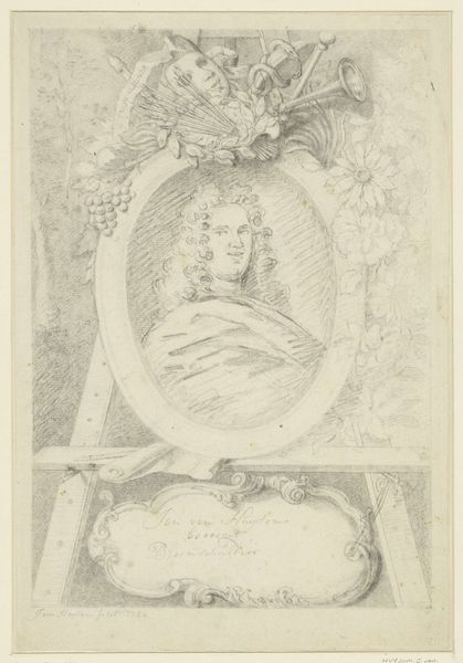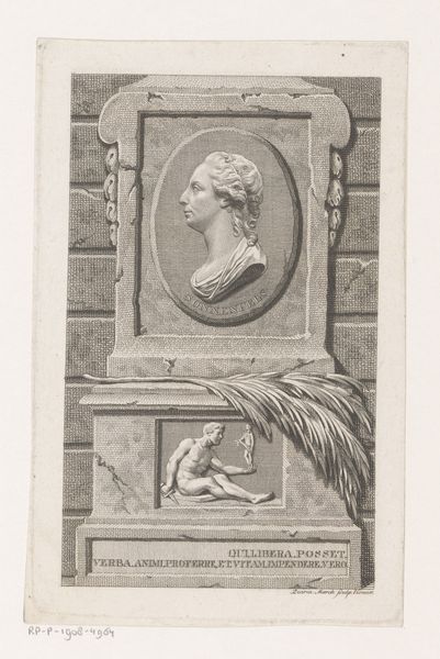 Editor: Here we have Matthias Gottfried Eichler's "Portret van Emilie van Berlepsch," sometime between 1758 and 1818. It's a baroque print on paper. It strikes me as a very formal portrait. What's your take on it? Curator: It's interesting, isn’t it? I see a certain theatricality – that almost aggressively elaborate hairdo, the oak leaves. There's a kind of monumentality even in a print. It reminds me of history paintings... sort of, though maybe a little less bombastic. Notice how Emilie is framed. Why do you think Eichler chose to surround her with those particular motifs? Editor: I see what you mean about the leaves—like she is some ancient goddess, even. I'm not sure about why he chose them... fame? Beauty? Something about her family, maybe? Curator: Yes! Perhaps these elements were meant to signify something very particular about Emilie’s station or perhaps something more personal... Do you think the addition of musical instruments tells us something about her passions? Editor: Ah, good question! The lyre makes it more symbolic, like she embodied music. So it's more than just a likeness, but an idealised image of her. It seems they wished to capture not just what she looked like, but *who* she was. Curator: Exactly! Prints like this were often made to circulate images widely and associate them with particular ideas. Perhaps Eichler had a certain audience or intent in mind. Think about how accessible this piece would have been at the time. Did our impression of it shift? Editor: Absolutely. I initially saw a standard portrait, but now I recognize that there is a whole world of meaning within it.