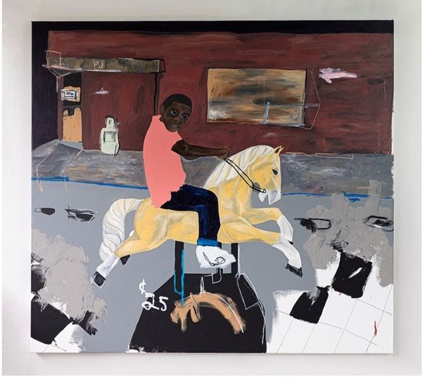 Curator: The painting here, titled "Our Children '1960'," was created by Jammie Holmes in 2020. It's an acrylic on canvas. What strikes you when you first look at it? Editor: There's a poignant sense of stillness, isn't there? A figure, perhaps a young girl, absorbed in an activity, almost as if caught in a fleeting memory. The color palette and unfinished line-work give it an aura of nostalgia and slight melancholy, in my eyes. Curator: Right. It is intriguing how Holmes gives a nod to figuration while seemingly situating this subject in a past. It seems that Holmes frequently engages themes of childhood and remembrance within the framework of the African American experience, often referencing historical contexts. How do the symbols in this image resonate, would you say? Editor: Immediately, I'm drawn to the inscription of '25¢'. Coupled with 'baby butt' scrawled on the adjacent surface, it evokes not just commodity but also questions around commodification. A 25 cent vending machine dispensed images of scantily clad women to appeal to youth in 1960; these references suggest both innocence and loss of innocence. How are these meanings coded? Curator: Yes, Holmes layers these symbols thoughtfully, nodding to both familiar commercial imagery and the private moments of play, but I think this can be situated within a longer artistic tradition. Consider how artists during the Harlem Renaissance also depicted children, but always with a sense of dignity and aspiration, reacting against pervasive racist caricatures. Does this, perhaps, re-present these traditions? Editor: Absolutely, in my opinion it directly speaks to a re-envisioning of those pictorial and psychological elements. Holmes here presents this interiority but filtered through a more fragmented lens, and is deeply unsettling due to its use of the figure’s stare to meet the viewer’s own. This is more than simply representation; this, I believe, attempts to depict and explore Black female personhood on the interior level. Curator: A lot to think about. This contemporary work really opens up channels for dialog. Editor: It makes you see how imagery functions, not just as visual experience, but as a repository of lived realities and inherited histories, definitely.