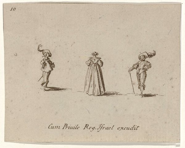 Curator: Let's discuss Israel Henriet's "Drie Figuurtjes," created around 1635. It’s a fascinating etching and engraving piece. Editor: My immediate impression is one of rather stark elegance, despite the seemingly casual poses. The fineness of the lines against that almost blank background makes for a very austere statement, doesn’t it? Curator: Indeed. Considering Henriet's role as a printmaker linked to the French court during Louis XIII’s reign, we can see these figures as embodiments of a specific aristocratic identity, a performance of nobility in a period of immense social stratification and religious conflict. Editor: It's the repetition that intrigues me. The near symmetry in their clothing – the capes, the hats, even the hint of swagger – invites a semiotic reading. Is this a statement about the regimentation of courtly life, or a deconstruction of individuality within social strata? Curator: Perhaps both. We need to see this through the lens of Baroque portraiture. The figures, likely male courtiers, adopt performative stances meant to signal their status and proximity to power. How do they construct and project an image of authority, virtue, and masculinity? The feathers are an interesting touch. Editor: They’re almost comically large, aren’t they? Emphasizing the vertical and creating a slightly absurd visual tension. Their scale disrupts any sense of perfect proportion. Could that be a subversive visual commentary from Henriet? A subtle mocking of courtly excess? Curator: That's a compelling thought! Consider also the materiality. The use of etching allows for a remarkable delicacy, a subtle shading that suggests rather than dictates. In thinking of this artist and these people, can we unpack a bit of queer or marginalized identity at all? What of the power and courtly connections to their gender presentation? Editor: That leads to an interpretation informed by feminist theory: a subversion embedded within the form. By subtly exaggerating these codes of masculine display, the artist exposes them as constructed, almost theatrical, rather than inherent. Curator: Absolutely. Thinking of the historical moment also: as European power consolidated amid violence and political struggle, image and artistic control became critical, didn't it? Editor: Yes. I’m leaving with a feeling that these elegant figures harbor a good deal of unspoken tension beneath the surface. It makes me see portraiture differently. Curator: For me, the artwork really underscores the entanglement of identity, politics, and artistic expression, inviting reflection on historical power dynamics.
