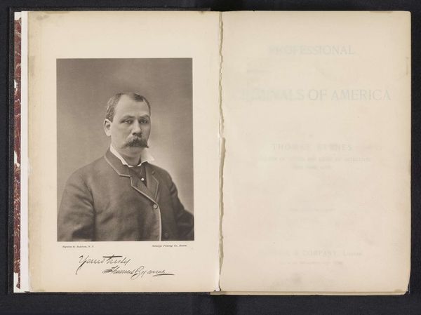 Editor: This print, "Portret van een onbekende man," was created before 1884 by The St. James's Photographic Company. It feels very posed, almost stiff, in its presentation. I'm struck by the symmetry and the enclosed frame within the album page itself. What can you tell me about its formal qualities? Curator: Observe how the photographic image, likely albumen print due to the date, adheres to the visual grammar of portraiture prevalent in the era. Consider the tonal range; notice how the gradations of sepia sculpt the form. Note also how the framing device interacts with the portrait; it both contains and emphasizes the subject within its geometric order. Editor: The limited color palette certainly lends a certain formality, even austerity, to the image. Is that intentional, or simply a result of the available technology? Curator: The monochrome palette directs us to appreciate texture and form – observe the smooth forehead contrasted against the intricate details of the moustache, or the crisp linen collar against the velvet jacket. How do these textures speak to you? Editor: I hadn’t thought about it that way, but the contrasts in texture really do bring the subject to life, giving the image depth beyond just a flat representation. Looking closely, the delicate frame seems to almost soften the intensity of his gaze. I will think more deeply about formal composition as part of how the photograph expresses its artistic goals. Curator: Precisely. By isolating the individual components and analyzing their interaction, we approach a deeper comprehension of the artistic merit, a testament to visual order in photography.