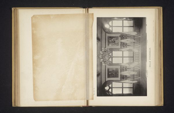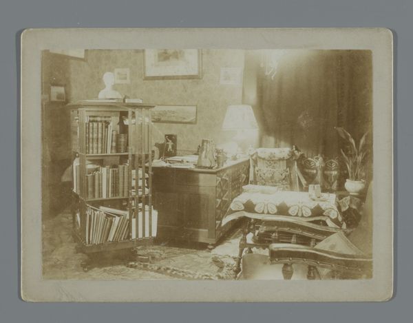 Curator: This intriguing photographic collage, made between about 1890 and 1896, offers a glimpse into the room of Henk van den Berg, located on Turfmarkt 3. It is assembled from three different photographic views of the same space. Editor: My first impression? It feels intensely personal, almost claustrophobic. Every surface seems covered in objects—books, pictures, fans... it's a sensory overload, even in black and white. Curator: Indeed. We see here the embodiment of late 19th-century bourgeois domesticity and the culture of collecting, reflecting imperial trade through its Japanese inspired art objects. This desire for ‘more’ can be directly correlated to socio-economic conditions afforded to this demographic and era. Editor: Absolutely, this imagery makes me think about cultural appropriation. To me, it's also a performative space, staged to project an image of cultivated taste and worldly knowledge. Who was this room *for*? Was it purely a private sanctuary, or was it meant to impress visitors, communicating an ideal of elevated masculine intellectualism and good taste? Curator: A crucial point. And that question resonates particularly because of how photography in this era served the politics of public display as well as personal mementos. We might read the wallpaper's patterning, as well as the interior decoration and design details, as deliberate strategies for fashioning a certain image of the self, both private and ready for society's gaze. The performativity of class is certainly visually asserted here. Editor: Seeing this image makes me reflect on how the personal and the political become entangled. Whose stories are valued enough to be preserved, aestheticized, and put on display for others, especially since Van den Berg collected artwork reflecting a different culture than his own. Curator: A relevant closing question. Studying this photographic collage, then, not only illuminates domestic life but asks questions of ownership and self representation in an evolving colonial Dutch landscape. Editor: And by encouraging reflection on these complex social and historical forces in visual art, perhaps we may encourage social transformation of museum audiences today.