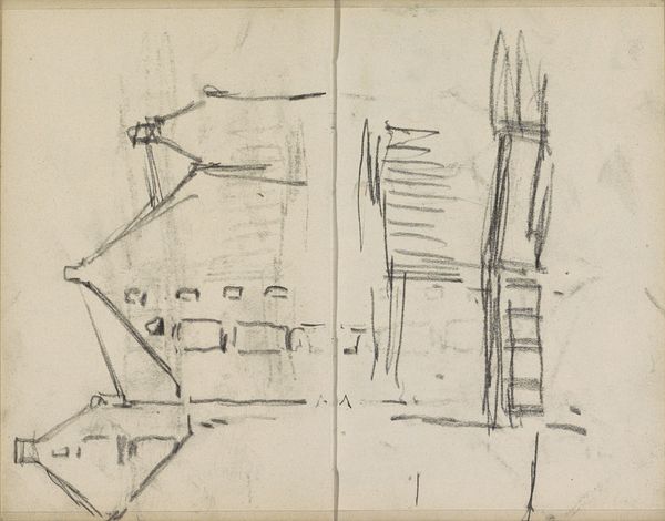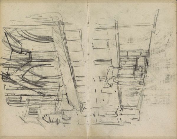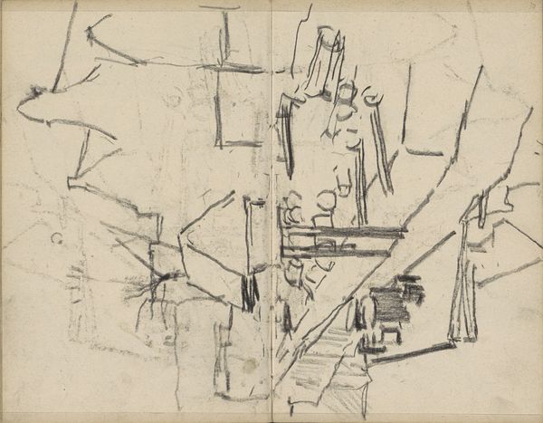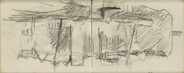 Editor: Here we have George Hendrik Breitner’s “Gezicht op de Nieuwe Teertuinen te Amsterdam,” created sometime between 1912 and 1919 using graphite and ink on paper. The frantic, scratchy lines really capture a sense of urban grit. What stands out to you? Curator: It's more than just grit, I think. This sketch, born from the realities of early 20th-century Amsterdam, isn't just a snapshot of a street; it's a lens into the socio-economic structures shaping urban life at the time. Editor: Could you elaborate on that? Curator: Breitner's work often depicted the working class and the marginalised. While seemingly an innocent street scene, we might consider who populates this space, and what social forces impact it? The Nieuwe Teertuinen, even today, carries echoes of its industrial past. Consider who benefits and who is potentially disadvantaged. Editor: That’s a good point; the lack of people and bleak strokes do feel heavy. It makes you think about the lived experiences of those who were present but aren’t represented. The absence is kind of telling. Curator: Precisely. And it compels us to question the narrative typically presented in art history, often dominated by the perspectives of the wealthy and powerful. Doesn’t it invite a deeper understanding of whose stories get told and whose are omitted? Editor: I see what you mean. It pushes you to see art as more than just aesthetics but as a commentary, even when it appears simple on the surface. Curator: Exactly, it’s about acknowledging art as a social practice embedded within power structures. This transforms our appreciation, adding layers of interpretation. Editor: That gives me a whole new way to look at it! Curator: And hopefully, a new way to question the world around us.