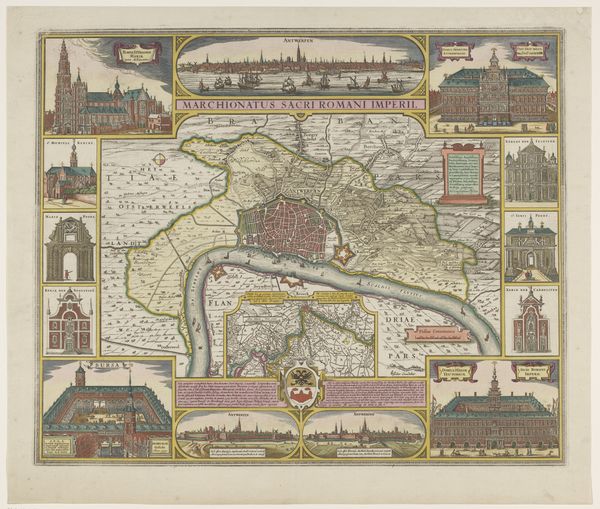 Claes Jansz. Visscher created this map of Antwerp and its surroundings using engraving techniques. The map intricately details the city's layout, enclosed by defensive structures, and is surrounded by vignettes of significant buildings. Visscher employs a strategic composition, framing the central map with smaller, detailed views, each rendered with a precise, almost architectural line. The consistent use of hatching and cross-hatching to denote depth and texture creates a cohesive visual language, unifying the diverse elements of the print. This formal approach, emphasizing clarity and order, aligns with the period's interest in structuring and understanding urban space. The city is presented not merely as a geographic entity but as a structured environment, reflecting humanist ideals of order and control over the natural world. Note the symbolic potential of the border images and imagine how they function within the political and cultural context of the time.