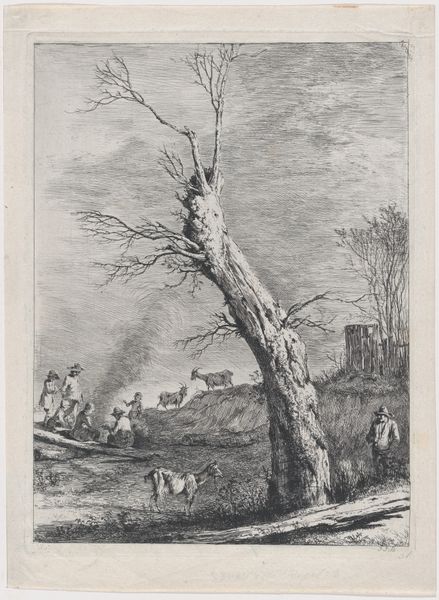 Editor: We are looking at Jacob van Strij’s, "Winter Landscape with pollard willows along a frozen ditch," an ink drawing dating back to sometime between 1766 and 1815. The skeletal trees and grey tones evoke a sense of stark isolation. How do you interpret the political or social commentary present in this seemingly simple landscape? Curator: It’s tempting to see this as a straightforward landscape, but let’s delve deeper. Van Strij painted this during a period of immense political upheaval in the Netherlands, a time when traditional power structures were collapsing under the weight of Enlightenment ideals and revolution. The pollard willows are very interesting—these aren't just trees. They've been deliberately shaped and managed. They speak to human intervention on the land. Does that start you thinking about control? Power? Editor: I hadn’t thought about it that way, but now that you mention it, the manipulated trees could represent the reshaping of society at the time. A rigid structure imposed onto nature. Curator: Exactly! And the "frozen ditch"? Water, which should flow freely, is trapped, immobilized. It evokes the stagnation that many felt under the old regimes. Moreover, landscape art itself was a form of nationalistic expression, claiming and celebrating the land amidst political uncertainty. The choice to depict winter, a season of dormancy, adds another layer. Is it despair, or is it the quiet promise of renewal after a period of repression? Editor: That’s a complex reading of the work. I see so much more than I initially did. I hadn't considered the sociopolitical undertones embedded within. Curator: Precisely! These landscapes can offer silent commentary on periods of radical social change. Art offers subtle but impactful narratives. I think this enriches the piece greatly.