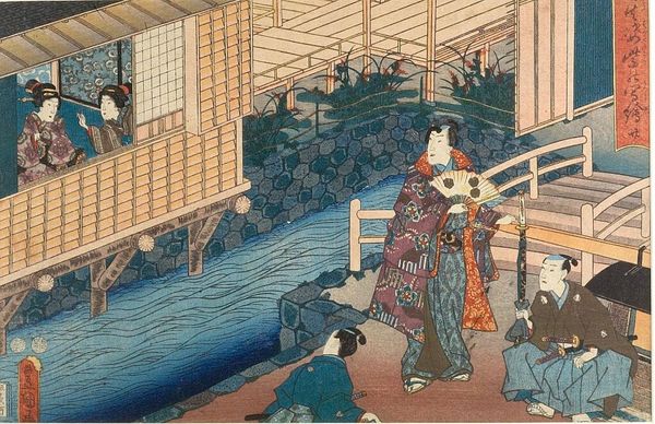 Curator: This is Utagawa Hiroshige's "Triptych: Summer Evening at Ryogoku Bridge," a woodblock print reflecting life in Edo, now Tokyo. It’s around 36 by 73 centimeters. Editor: It's like a hazy, summery dream. The blues are so cool and calming, but there's a buzz of activity that gives it this restless feeling, too. Curator: Absolutely. The triptych format itself speaks to production—requiring three separate blocks, more labor, and a wider consumption market for prints like these. Editor: The way the figures are placed, almost like stage actors, against the bustling water... I feel like I'm overhearing snippets of conversation. Curator: Note how the water isn’t just a backdrop. It’s a critical artery for trade, travel, and leisure; the city’s lifeblood, depicted via skilled carving and printing techniques. Editor: The mood, that's what lingers. You can almost smell the river and feel the evening humidity; it's captivating. Curator: It speaks to the power of art to capture a specific moment within a complex social and economic context. Editor: A fleeting moment given a beautiful, lasting form.