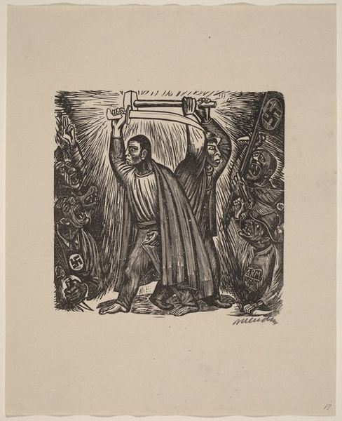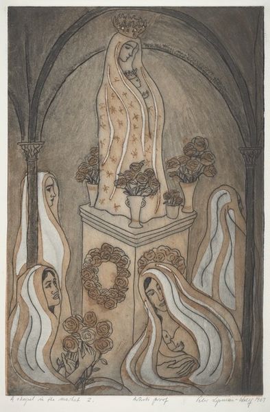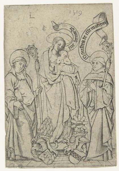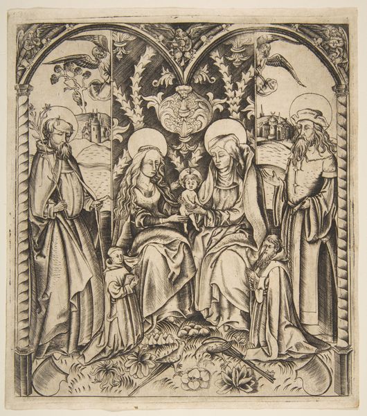 Editor: Here we have Gertraud Brausewetter’s “The Christ Child with the Virgin Mary” from 1917, a print that has the quality of a pen drawing. The detailed lines create a rich scene with Mary, the Christ child, and four angels. It feels both reverent and a little otherworldly to me. How do you interpret this work? Curator: It strikes me as deeply embedded in symbolism, doesn't it? The radiant light around the Christ Child, for instance, is a visual echo of divine energy and spiritual purity. The angels, each bearing instruments, aren’t just decorative; they're active participants, invoking sacred sound and harmony. Have you considered what the stylized floral patterns surrounding the figures might represent? Editor: Maybe the flowers are another symbol of purity and beauty associated with Mary? Or possibly referencing the Garden of Eden? Curator: Precisely! They root the scene in earthly and spiritual abundance, while also recalling pre-lapsarian innocence. Notice how Mary’s gaze is cast downwards? It is a posture that traditionally represents humility, but what else might it communicate within the context of post-World War I art? Editor: Perhaps it is conveying sorrow or contemplation during a period marked by suffering. Curator: Yes, Brausewetter created this soon after the Great War began, and the Virgin Mother may symbolize empathy during immense pain. The figures, bordered by darkness, might represent the chaos caused by the war and the longing for maternal comfort during those bleak years. It reflects deep cultural anxieties, using enduring religious symbols to negotiate contemporary trauma. Editor: That context makes the piece resonate much more profoundly. The imagery really amplifies those emotions! Curator: Indeed, seeing the piece as a reflection of a culture grappling with conflict adds a potent layer of meaning. I see now how visually rich yet painful the image has become through our dialogue.