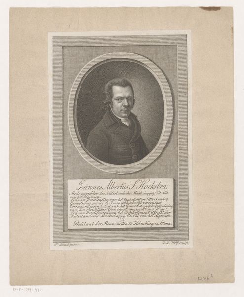Curator: This engraving, dating roughly from between 1795 and 1895, presents a portrait of Jean Paul. The artist, Friedrich August Brückner, captured Jean Paul's likeness through meticulous lines on a printed medium. Editor: The initial impact is one of quiet contemplation. The subject seems caught in a moment of introspective thought. There’s a solemnity to the image that, even rendered in a seemingly simple print, evokes a certain emotional depth. Curator: It’s interesting you say that. Jean Paul, born Johann Paul Friedrich Richter, was a German Romantic writer known for his whimsical and sentimental novels. Brückner, as an artist, had the task of capturing not just the external appearance, but the intellectual spirit of this literary figure. Consider the context: portraits in this period served to solidify the public image of prominent individuals. Editor: Absolutely, and one cannot divorce the piece from Romanticism and its engagement with individual feelings. Jean Paul, as a subject, embodies this focus, challenging Enlightenment ideals with explorations of the sublime. This engraving immortalizes an intellectual leader in German society and it will contribute to forming an impression for decades to come. The act of distributing a print also has profound social implications, as it becomes widely available. Curator: Precisely. And prints such as these served a very crucial function in distributing images to the masses at the time. How could an engraver convey that sort of sentimentality or deep thought? What techniques did they use to signal it? Editor: Looking closely, it’s the subtle shading and the detail in the eyes that suggest a rich inner life. There's also an elegance in the composition, in how the oval frames and focuses the subject's gaze on the viewer. His collar, hair and jacket show a very self-aware person too. He knew how his own image was constructed. This is very telling of an intellectual circle of the time. Curator: I concur. By situating "Portret van Jean Paul" within its historical moment, we reveal layers of meaning, social function, artistic technique, and philosophical reflection intertwined in the depiction of this singular individual. Thank you. Editor: A profound demonstration of how art intersects with our complex notions of identity and its performance in social settings. Thank you.