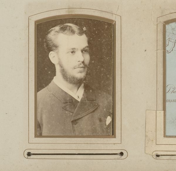 Curator: This is a fascinating portrait from between 1880 and 1905, entitled "Portret van een man met snor en baard," or "Portrait of a Man with a Moustache and Beard," currently held at the Rijksmuseum. It’s a gelatin silver print. Editor: My initial impression is a kind of austere dignity. The sepia tones and the oval frame lend it a classical feel, almost like a cameo, but there's a modernity in the sitter's casual pose and the soft focus. Curator: Yes, the photograph’s materiality is intriguing. Gelatin silver prints became widely accessible during this period, leading to a boom in portraiture as a form of self-representation for the burgeoning middle class. Think about the democratization of image-making taking place at this time. Editor: Absolutely, the availability of such processes shifted portraiture's function. This isn't just about aristocratic legacy. It’s a moment in which individuals could commission images of themselves to circulate within their social sphere, bolstering their social capital. Curator: The photographer, Herman Salzwedel, whose name is also given in this context, appears to employ soft focus, giving it an almost impressionistic quality despite photography typically aiming at realism. It highlights the artistic manipulations that photographers employed to elevate the form. Editor: Consider also how these portraits were consumed. They were placed in albums, displayed in homes – active participants in shaping the narrative of the family and projecting a particular identity. What does this photograph convey about status or aspiration? Curator: That's a key question. Note also the plain background; rather than props that define one’s trade or class, there is simply a concentration on the individual and his essence. Also, the surface is beautifully preserved, telling about curatorial practices over time, of conservation. Editor: Indeed. What initially strikes us as a simple image reveals complex intersections of social mobility, technological advancements, and aesthetic aspirations. These factors came together at this critical historical moment. Curator: The photograph, in the end, encapsulates both the democratization and artification of portraiture. It also shows how those lines can become blurrier in their meanings and their function, as a historical product and object.