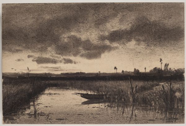 Editor: Here we have Simon Moulijn’s “Vlak landschap met ven,” a 1924 etching, currently held at the Rijksmuseum. The monochrome image and tight crop create a sort of contained stillness; it makes me wonder about Dutch identity in the interwar period. What story does it tell? Curator: This work resonates deeply with the interwar period’s socio-political landscape, echoing a yearning for stability. How might the flatness you observed in the composition serve as a visual metaphor? Editor: Perhaps, this simplicity and flatness speaks to a collective desire for calm after the turmoil of World War One. It certainly resists grandeur. Curator: Precisely. It shies away from overtly nationalistic or heroic narratives common in earlier landscape painting. Think about the role of institutions like the Rijksmuseum in shaping national identity: does Moulijn’s work reinforce or subvert these expectations? Editor: That's a good point. Displaying such a humble landscape probably served to democratize ideas around Dutch pride and belonging. It pictures somewhere any person might find. Curator: And consider the medium – printmaking made the artwork accessible to wider audiences. Does this suggest a shift towards more democratic artistic practices in the Netherlands during this time? Editor: Yes, the relatively inexpensive nature of printmaking allowed more people to own art, shifting away from the patronage of the wealthy elite that had dominated the art world. It’s a small piece, but speaks volumes about the democratization of culture! Curator: Indeed. It serves as a potent reminder that even seemingly quiet landscapes can be deeply intertwined with broader social and political currents. Editor: I now see the picture as actively reshaping Dutch national identity! Thanks!