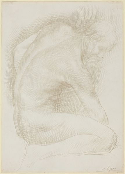 Alphonse Legros created this drawing, *Study of a Figure*, using graphite on paper. The choice of graphite as a medium is significant: its accessibility and ease of use makes it a democratic material, readily available for sketching and preliminary studies. The artist's hand is evident in the delicate lines and subtle gradations of tone. The way the graphite is applied to the paper reveals a layering of marks, building up the form of the figure through careful observation and rendering. This process involves both precision and control. The drawing appears to be a preparatory study, possibly for a larger painting or sculpture. Its existence speaks to the labor-intensive nature of artmaking. Legros has captured a fleeting moment of human form and expression through humble means. We can appreciate how this simple combination of graphite and paper embodies artistic vision.