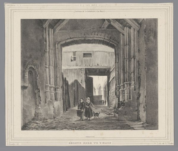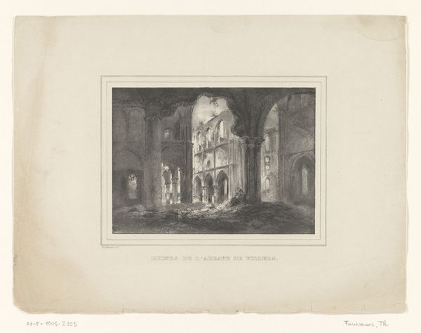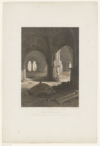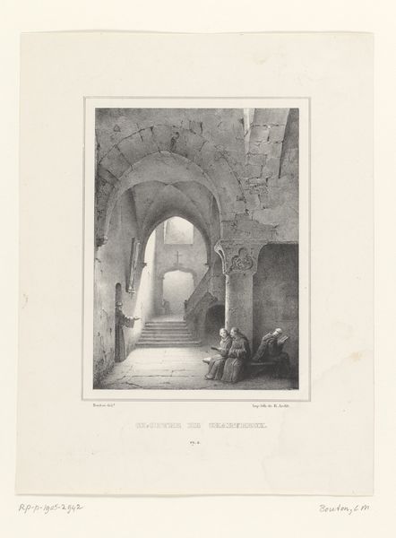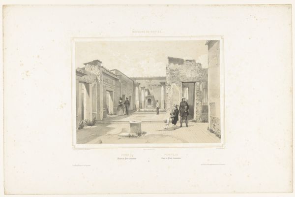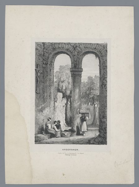 Curator: This 1832 pen drawing by Charles Marie Bouton is titled, "Two Women in the Ruins of an Ancient Bathhouse." Editor: My first impression is melancholy. The delicate pen strokes create a scene of decay, but there's something almost serene about the women in this ruined space. Curator: Absolutely, the romantic style lends itself to such a feeling, highlighting a bygone era, a historical yearning perhaps. Think about the symbolism: ruins often represent the transient nature of power and beauty, inviting us to reflect on history's lessons. Editor: Right, and you can see that materially. The drawing on paper emphasizes the artist's deliberate process in capturing this particular subject, in that moment. How different the effect might be with other media. This is a pretty straightforward rendering of a ruin... Were architectural drawing skills prized in the 19th century? Was paper or pigment production influencing artmaking at the time? Curator: I imagine architectural renderings would require acute training, yes, to deliver clear representational communication. Note that Bouton situates the women in this space to provoke thought about temporality— perhaps alluding to how the human figure relates to overarching notions of civilizational rise and decline, ruin, decay. They’re seated right there on the cool floor...witnesses to history. Editor: Interesting, I wonder then what the everyday reality of those women looks like juxtaposed to the ruins that surround them. Is this a realistic portrayal of that contrast or an idealized vision from the artist, or for the intended consumer? The stark black lines against the white of the paper give me a clear view of how the architecture is actually built, the work put into the structure, which is very helpful for considering labor questions... Curator: Precisely! And Bouton, working in pen and ink, is drawing on centuries of associations between ruin imagery and morality, decline and perhaps a hope of rebirth—a symbol meant to move you, change you! Editor: I appreciate how it pushes me to look more critically at both the beauty and the construction, literally, of historical narratives and its reflection on those experiencing its decay and present in it. Curator: I'm leaving with a sense of quietude that’s so affecting, as it draws into contemplation on civilization itself, and how humans interact with these crumbling, weighty, spaces.