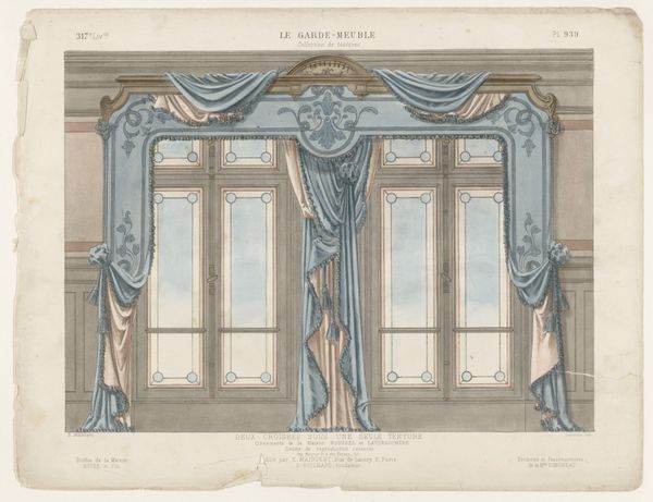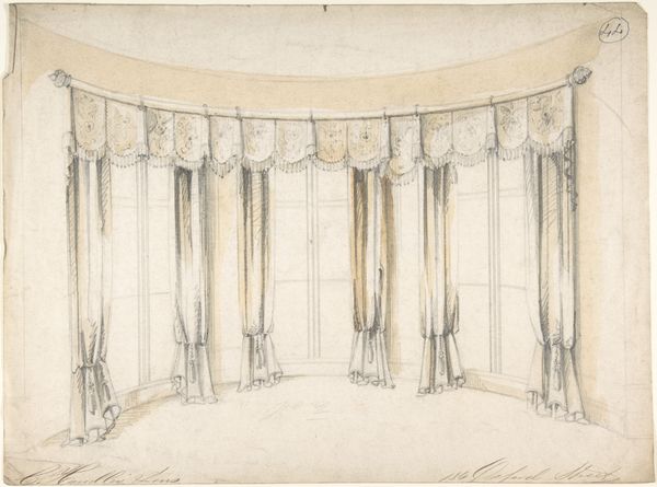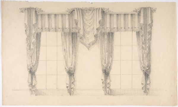 Curator: Well, hello! I see that we have before us "Design for Window Drapery," dating sometime between 1830 and 1900. It is a work on paper, using pencil and pen—we might even say a sketch! It lives here at the Metropolitan Museum of Art. Editor: Oh, I like this. My first thought? Elegant theatre! It is as if the curtain is about to rise on a fascinating domestic drama. I love how meticulously detailed the rendering is, while it still somehow has this breezy, ephemeral feel. Curator: Exactly! The symmetry speaks to the design aesthetic of the time, the focus on balance. But more than that, it whispers to the social life of those grand homes. Windows, light, display—a way to be seen and a frame through which to view the world outside. Editor: Right. All that draping must have soaked up a lot of light! Think of the textures: how that would play with sunlight in the room...almost baroque! Do you think the sketch aspect gives it a forward-looking quality? Like, 'here’s how we are thinking of adorning space'? Curator: Yes, indeed. Design became an increasingly specialized and professional pursuit during this era. And this detailed sketch underscores that transition. Someone wasn't just thinking, “let's put up some curtains.” It's an articulation of an idea for potential clients, reflecting shifts in production and marketing. Editor: Makes me ponder the politics embedded in these designs, the messages these windowscapes projected about wealth and taste. It seems almost absurd in its overt display, but somehow graceful! Curator: I find that interesting. Were you able to step inside the lives behind those windows? Were these designed to both conceal and reveal at the same time? It would really speak to how architecture both reflects, and perpetuates class difference. Editor: True. The artist captures so many subtleties. Thinking about the craft... you see how the artist’s attention can transform simple things, like drawing materials, into something truly extraordinary. Curator: Looking at this makes me appreciate the small glimpses it gives us into both private and public life in that era. Thank you for that insight. Editor: And I find myself appreciating that line between the artistic impulse and historical context—that tension is always fertile ground for a more complex vision of life.
