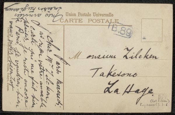 This is a postcard to Philip Zilcken by J. Fujikawa. We don’t know exactly when it was made, but its existence suggests a moment of cultural exchange. In the late 19th and early 20th centuries, Japan experienced a period of rapid modernization and engagement with the West. Against this backdrop, individuals like J. Fujikawa navigated the complexities of cross-cultural communication. Addressed to Monsieur Zilcken in The Hague, Holland, the postcard, written in French, symbolizes the intersection of languages and cultures. The choice of French, rather than English, speaks to the nuances of international relations and the specific cultural milieu of the intended recipient. Consider how the simple act of sending a postcard becomes a profound expression of identity, connection, and the desire to bridge geographical and cultural divides. The emotional resonance of this small artifact lies in its ability to evoke the shared human experience of reaching out to others across borders.