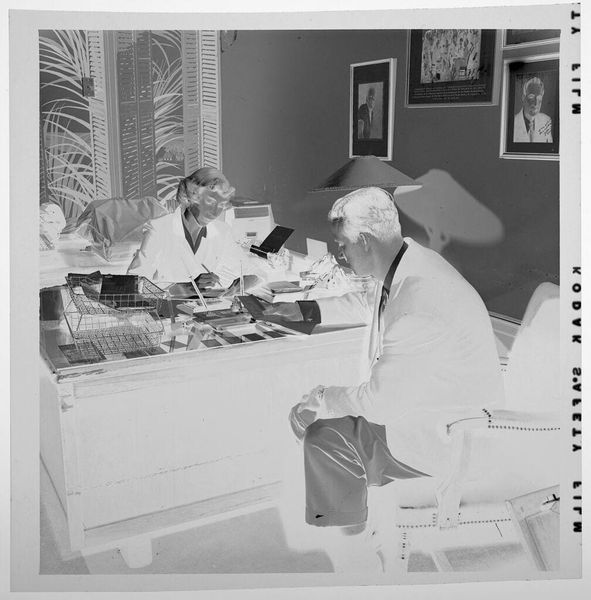 Curator: This is an Untitled work by Jack Gould, part of the Harvard Art Museums' collection. It depicts a man and a woman sitting on opposite sides of a desk. Editor: It feels like a stage set, doesn't it? All the props so carefully placed. A little world contained in this tiny black and white frame. Curator: Indeed. Gould's choice of gelatin silver print as the medium, given the social context of accessible photography at the time, allowed for mass dissemination and a standardization of image-making. Editor: It’s fascinating how the negative image lends an ethereal quality, almost ghostly. I see the desk acting as a clear border between the two figures. What do you think they’re discussing? Curator: Considering the photographic process and its reliance on darkroom labor, this image speaks to a specific mode of photographic production and its social implications. Editor: For me, it's a quiet moment, a story unfolding. A shared space, yet a silent divide between these two. Curator: The image’s material existence and method of production are just as crucial as any narrative interpretation we might impose. Editor: Perhaps, but the human element, the mystery, still whispers so loudly.