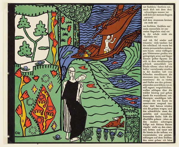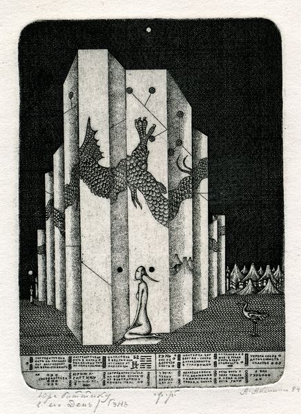 This image by Heinrich Lefler visualizes a scene from "Die Bücher Der Chronika Der Drei Schwestern 17," employing a vertical composition which is divided into distinct zones, each revealing a different part of the narrative. The overall structure is fragmented, yet unified by a muted palette of browns, reds, and creams. Lefler uses line work with detailed geometric and organic patterns to delineate forms. This flattening effect is reminiscent of medieval tapestries. The upper register features symbolic heraldry and architectural elements, with the lower part showing a lone figure and a grand staircase. This tiered arrangement suggests a journey through different states of being and a hierarchy of spaces. The visual encoding relies heavily on cultural codes—heraldry, architecture—to build its narrative. The destabilization of depth and perspective creates a dreamlike quality that underscores the artwork's engagement with themes of transformation and myth. This is not just decoration, but a profound exploration of symbolic language and the architecture of the imagination.