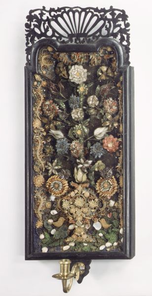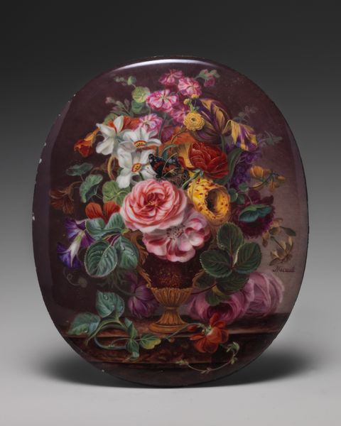Editor: Here we have Dirck van Rijswijck’s "Floral Still Life," created around 1662 using mixed media on panel. It has such a stark, striking presence. What are your first thoughts when you see this artwork? Curator: The piece immediately situates itself within the opulence of the Dutch Golden Age. I’m drawn to the social implications of representing luxury. It is not merely decorative, it speaks volumes about wealth, global trade, and even a certain kind of scientific ambition to catalogue and classify nature during this era. Editor: So, these carefully arranged flowers aren't just pretty? Curator: Exactly. Consider where the resources for creating this panel would have come from, both the materials and the patronage. Who commissioned this, and what statement were they trying to make about themselves through it? Editor: The use of mixed media, like the mother-of-pearl inlay, emphasizes the painting's extravagance. What's fascinating is that these elements weren’t locally sourced, correct? They tell a global story of trade, labor and status. Curator: Precisely. By presenting global resources, Rijswijck situates wealth and questions ideas around power in the 17th century. How does it make you consider contemporary parallels related to environmental and labor issues associated with luxury goods today? Editor: I guess seeing it this way adds layers of meaning and asks more relevant questions. It makes this Baroque decorative art still ring true today. Curator: I agree. Looking closer can encourage dialogue about art, its connection to broader historical and societal forces and maybe our values today, which I find deeply empowering.