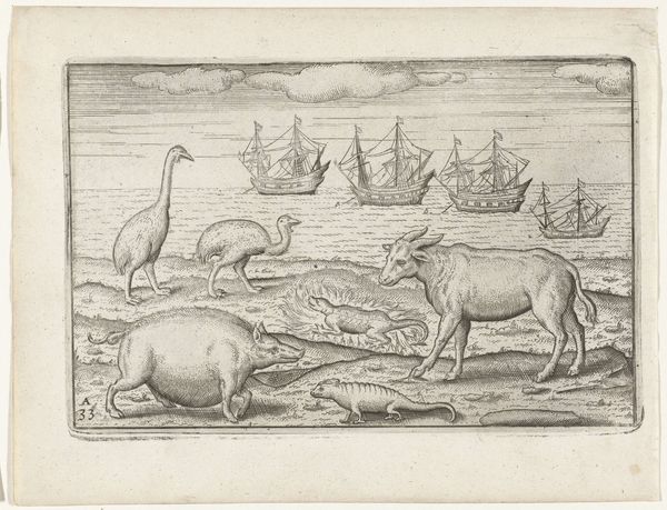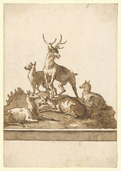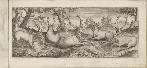 Editor: This etching, "Jacht op een hert," or "Hunt for a Deer," was created sometime between 1655 and 1718 by Jan (I) Griffier. The scene depicts a stag being pursued by hounds. It feels very dynamic, like a captured moment. What social commentaries or historical observations can we glean from this artwork? Curator: This print offers a lens into the complex relationship between humans, animals, and the landscape during that period. Hunting, then and now, wasn't merely a sport; it was tied to class, land ownership, and power dynamics. How do you think Griffier's depiction of the hunt reflects these power structures? Editor: I suppose the hunter, usually an unseen but central figure in these scenarios, is exhibiting dominion, with the stag representing the subjugated natural world. The act seems less about sustenance and more about a demonstration of control. Curator: Precisely. And consider the stag itself: it is a symbol frequently associated with virility, nature, and even a certain wild nobility. By depicting its pursuit and inevitable capture, what message do you think Griffier might be conveying about the relationship between civilization and the untamed wilderness, and the gendered associations within? Editor: Perhaps it shows an assertion of human authority over these idealized, masculine attributes of the natural world. I see the hounds actively participate in it too. It's a multi-faceted narrative of power. Curator: Indeed, it reflects broader socio-political anxieties of the time – anxieties about controlling both the natural world and social order. We also might consider the ethics of the hunt, or, who has the right to dominate nature in such a dramatic form. How does examining works like this help us confront current environmental issues and ethical debates around our treatment of animals? Editor: That's something I hadn't considered before. Viewing art as a means to examine our past and current relationships with the natural world adds a lot of layers of complexity. Thank you for sharing your perspective! Curator: My pleasure! Looking at art through a social and historical lens helps us recognize the enduring echoes of the past in our present.