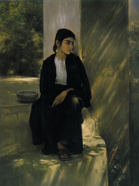 Curator: Here we have Camille Corot's "Melancholy Italian Woman," an oil on canvas completed between 1826 and 1827. Editor: The melancholy is palpable. She seems burdened by something unseen, almost as if she is reflecting the weight of unseen burdens that are embedded within a societal structure. Curator: Indeed. It is striking how Corot conveys that emotion. The coral necklace seems almost a symbolic adornment, not joyous but something more ancient, a remnant of tradition perhaps. Coral’s ties to protection… could it symbolize resilience in the face of sorrow? Editor: I'm drawn to how her simple white blouse contrasts with the deep, earthy tones of her skirt and the room's minimal furnishings. This visual starkness can suggest a social and economic divide, maybe highlighting the limitations placed upon women, especially of a certain class, during that era. The simplicity can hide oppression. Curator: That's a fascinating reading. I also think about the composition. Her gaze is directed away from us, drawing us into her private world. The soft light on her face gives her an almost iconic quality, reminiscent of devotional images. The psychological depth creates space for her inner narrative. Editor: Exactly. We could look into what Corot intended the setting to symbolize, however it can never be fully determined. And the truth is this woman may also be acting out a narrative for a particular patron's pleasure. Regardless, that weight that the painting brings across becomes part of a larger narrative of social inequalities. Her melancholy is not merely personal; it is contextualized. Curator: So, while "Melancholy Italian Woman" invites us into a singular moment of introspection, your reading reveals how Corot has captured both individual emotion and subtle undercurrents within a larger cultural landscape. Editor: It makes us think about whose stories are told, whose feelings are documented, and within which frame. The gaze directed from within the picture forces our view beyond an individual, to contemplate an existence bounded in both its beauty and oppression.