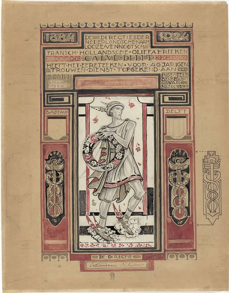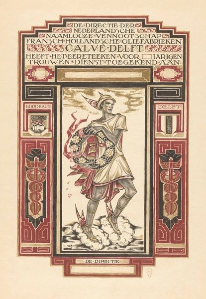 Editor: So, this is a design for a loyalty award – *Ontwerp voor: Diploma voor trouwe dienst bij de Nederlandsche Gist- en Spiritusfabriek* made by Richard Roland Holst in 1924, using ink on paper. I find the figure really striking - quite elegant. The details on the caduceus and Art Nouveau elements around the border makes it pop, somehow giving it this somber vibe and regal touch all in one. How do you interpret this piece, given it’s design and specific intention? Curator: You know, I see echoes of ancient myth blended with the industrial spirit of the roaring twenties. Mercury, messenger of the gods, is offering a wreath…almost a benediction, perhaps even a sly wink, to those faithful employees. There's a gentle melancholy in his eyes, don’t you think? Holst wasn’t just creating a pretty picture. This work feels steeped in history and symbolism. The wings on Mercury's ankles are about the journey and relentless commitment, yet with a touch of decorative flair from that time. Is it not fascinating how they transformed something utilitarian – a reward for service – into something beautiful and deeply meaningful? Editor: It is interesting. I didn’t really think about the somber and mischievous elements mixed together like that. Curator: It's like Holst is playfully posing us a riddle. He knew these companies would benefit from strong imagery that stood the test of time. Makes me wonder what *our* certificates of appreciation will look like 100 years from now! Editor: True! Something to think about in our contemporary visual landscape. Thanks for opening my eyes to those fascinating details.