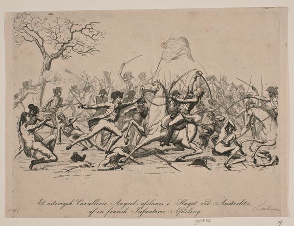 Editor: Here we have "George Washington in de Slag bij de Monongahela," created in 1854 by Claude Régnier. It's an etching and engraving, so a print, depicting a pretty chaotic battle scene. What immediately strikes me is the almost cinematic composition, with Washington seemingly unmoved amidst the frenzy. What do you make of it? Curator: It is indeed a moment frozen in time, a highly romanticised version of history as told through 19th century eyes, isn't it? Forget the smoke and fury of battle; we’re invited instead to witness the stoic heroism of a man already destined for greatness. Think of it not as a faithful recreation, but a stage setting; consider what stories that set is meant to evoke in the viewer. What details grab you most in thinking of the story of the moment portrayed? Editor: I’m drawn to the light. It feels like a divine spotlight is shining on Washington, setting him apart. Also, the inclusion of the indigenous fighters feels…well, complex, considering the historical context. Curator: Ah, yes, the light! That ethereal glow isn’t just illuminating a hero; it’s actively myth-making. Think about it - What are they meant to signify beyond a visual representation of conflicting sides? Do you think the artist tried to comment on that history? Editor: Maybe a romantic, albeit misguided, attempt at portraying complexity, yet ultimately perpetuating a certain narrative. It is striking how staged and unnatural it all feels, given the real horror of conflict. Curator: Exactly! Perhaps it invites us to reflect on how history itself is constructed, not just through events, but also through their artistic interpretations. I leave this viewing with more questions than answers, actually! Editor: That's the beauty of art, isn’t it? Always more to see, to question, to feel. I see that now!