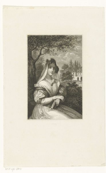 Curator: What strikes you first about this engraving, Editor? It's called "Jonge vrouw in bruidsjapon," or "Young Woman in a Wedding Dress," created sometime between 1837 and 1854 by Willem Frederik Wehmeyer. Editor: Oh, there's such a wistful vulnerability. It feels almost stolen, like a private moment caught on the page, you know? She's not directly engaging with us, is she? Curator: Indeed. It's that averted gaze, typical of Romantic portraiture, which lends the scene an air of intimacy and contemplation. Wehmeyer understood the symbolic language of gesture and drapery quite well. Notice how the veil both conceals and reveals, playing with notions of modesty and anticipation. Editor: That veil! It’s so diaphanous. It's fascinating how something that’s meant to suggest purity or even containment can also whisper of freedom and something just beyond grasp. Is she nervous, excited, trapped, hopeful... or maybe, a little bit of everything? Curator: Precisely! The image becomes a repository for a range of emotional interpretations precisely because it leaves so much unsaid. This was part of the intention. Artists in the Romantic period were invested in portraying inner psychological states through external visual cues. Editor: So she's more symbol than woman, in a way? Which got me thinking: what are bridal dresses *really* for? Public performance, family legacy, self-actualization…? There's such a complex interplay of ideas around them. Curator: They are inherently ritualistic, Editor. Think about how throughout history, bridal garments carry the weight of societal expectations and cultural memory. Color, fabric, embellishments… all communicate status, virtue, and family history. Wehmeyer plays with these ideas in a subtle way by placing the figure off-center, creating a sense of imbalance that invites inquiry. Editor: Imbalance… I love that read. I almost wish it weren’t framed so neatly in the oval. I just want her to step right out of it. Curator: Perhaps that yearning for release is precisely the emotional resonance Wehmeyer hoped to inspire. He was quite attuned to the aesthetic and symbolic currents of his era. Editor: It does invite contemplation, a kind of suspended narrative. Well, thanks for shining a light on the complexities here. Curator: And thank you, Editor, for that intuitive and beautifully worded response!