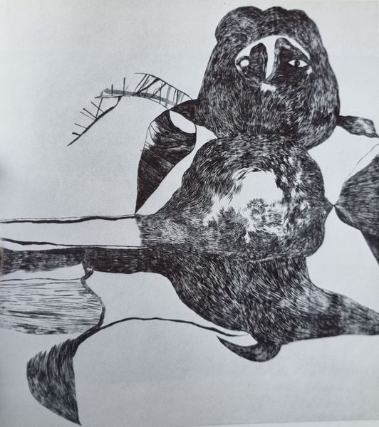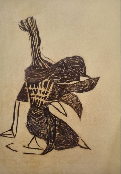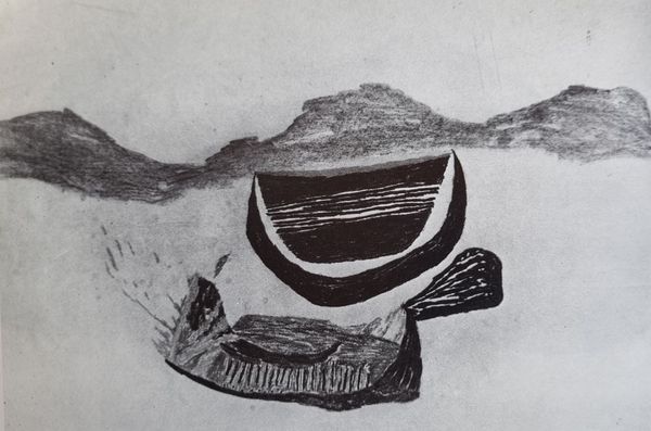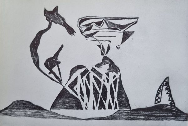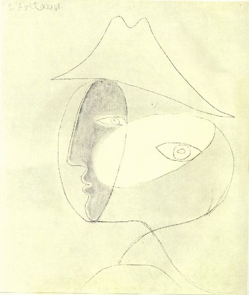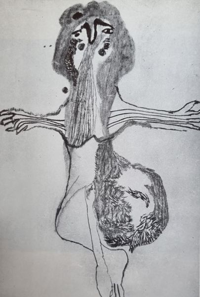 Editor: This is Vajda Lajos's 1938 ink drawing on paper, "Mask with Braid." It feels almost like a symbolic map, unsettling yet somehow familiar. How do you interpret this work? Curator: The power of masks lies in their capacity to be both revealing and concealing. Notice how Vajda abstracts the facial features. What is communicated through the braided element dangling below? Perhaps a release of pent-up expression, or a tangible sense of burdened history. The mask appears to be flayed open across the forehead. Editor: I see what you mean. The braid could represent the unravelling of identity, almost like a shedding. The open forehead does imply a certain vulnerability. Curator: Exactly. This mask isn’t merely decorative; it’s a vessel brimming with symbolic intent. This disjunction between the ordered parallel lines in the center and the erratic and wild outer forms create a tension, no? Where might we find parallel, but ultimately fractured identities in the cultural landscape of 1938, I wonder? Editor: It is hard not to read the approach of war into the sense of tension between order and chaos here. Perhaps Lajos sensed it, too. I hadn’t thought of the cultural context so directly. Thank you! Curator: Art serves as a record of personal and shared emotional responses, of felt-knowledge beyond dates and events, it provides us continuity with lived cultural memory. Now, how might your own interpretation evolve by engaging with what we have noticed here?