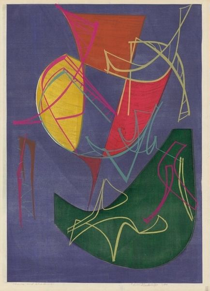 Curator: This abstract print by Klaus Meyer, held in the Tate Collections, presents a fascinating interplay of geometric and organic forms. Editor: It's quite striking. My initial impression is one of disorientation, almost as if the natural world is being fragmented and viewed through a fractured lens. Curator: The overlapping shapes, the suggestion of a tree… could the artist be exploring the tension between nature and imposed order? Perhaps the diamond represents societal structures attempting to contain the wild. Editor: Interesting idea! Thinking about the process, the printmaking technique itself, with its layers and defined shapes, reflects that ordering process, doesn't it? Each color a separate act of labor, building the image. Curator: Absolutely. And the tree, a recurring symbol of life, growth, and interconnectedness... it feels restrained here. Editor: Well, seeing the artwork this way has given me a new perspective. Curator: Indeed, it's a reminder of how art can reflect the complexities of our relationship with nature.